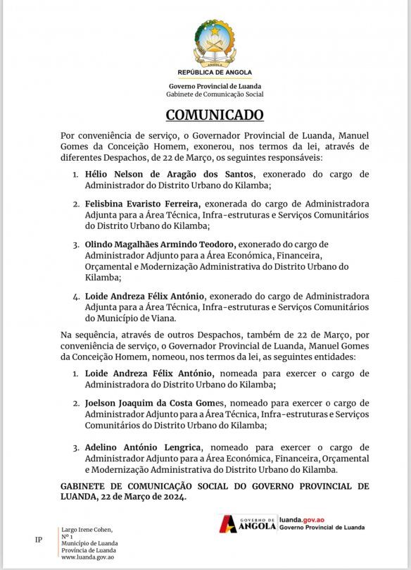 Por conveniência de serviço, o Governador Provincial de Luanda, Manuel Gomes da Conceição Homem, exonerou, nos termos da lei, através de diferentes Despachos, de 22 de Março, os seguintes responsáveis:1. Hélio Nelson de Aragão dos Santos, exonerado do cargo de Administrador do Distrito Urbano do Kilamba;2. Felisbina Evaristo Ferreira, exonerada do cargo de Administradora Adjunta para a Área Técnica, Infra-estruturas e Serviços Comunitários do Distrito Urbano do Kilamba;3. Olindo Magalhães Armindo Teodoro, exonerado do cargo de Administrador Adjunto para a Área Económica, Financeira, Orçamental e Modernização Administrativa do Distrito Urbano do Kilamba;4. Loide Andreza Félix António, exonerado do cargo de Administradora Adjunta para a Área Técnica, Infra-estruturas e Serviços Comunitários do Município de Viana.Na sequência, através de outros Despachos, também de 22 de Março, por conveniência de serviço, o Governador Provincial de Luanda, Manuel Gomes da Conceição Homem, nomeou, nos termos da lei, as seguintes entidades:1. Loide Andreza Félix António, nomeada para exercer o cargo de Administradora do Distrito Urbano do Kilamba;2. Joelson Joaquim da Costa Gomes, nomeado para exercer o cargo de Administrador Adjunto para a Área Técnica, Infra-estruturas e Serviços Comunitários do Distrito Urbano do Kilamba;3. Adelino António Lengrica, nomeado para exercer o cargo de Administrador Adjunto para a Área Económica, Financeira, Orçamental e Modernização Administrativa do Distrito Urbano do Kilamba.GABINETE DE COMUNICAÇÃO SOCIAL DO GOVERNO PROVINCIAL DE LUANDA, 22 de Março de 2024