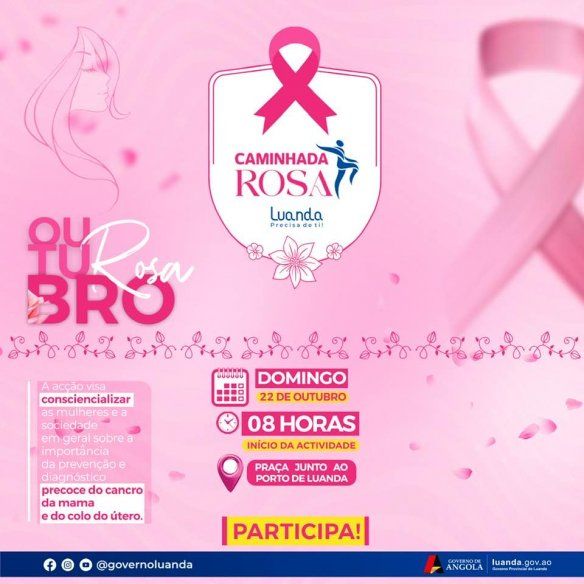 neste domingo, 22 de Outubro, a Caminhada Outubro Rosa - Luanda Precisa de Ti.O Governo Provincial de Luanda convida a todos a fazerem parte dessa corrente de sensibilização sobre a importância da prevenção e do diagnóstico precoce do cancro da mama e do colo do útero.Participa! Ajuda a salvar vidas!Luanda Precisa de Ti!Gabinete de Comunicação Social do Governo Provincial de Luanda