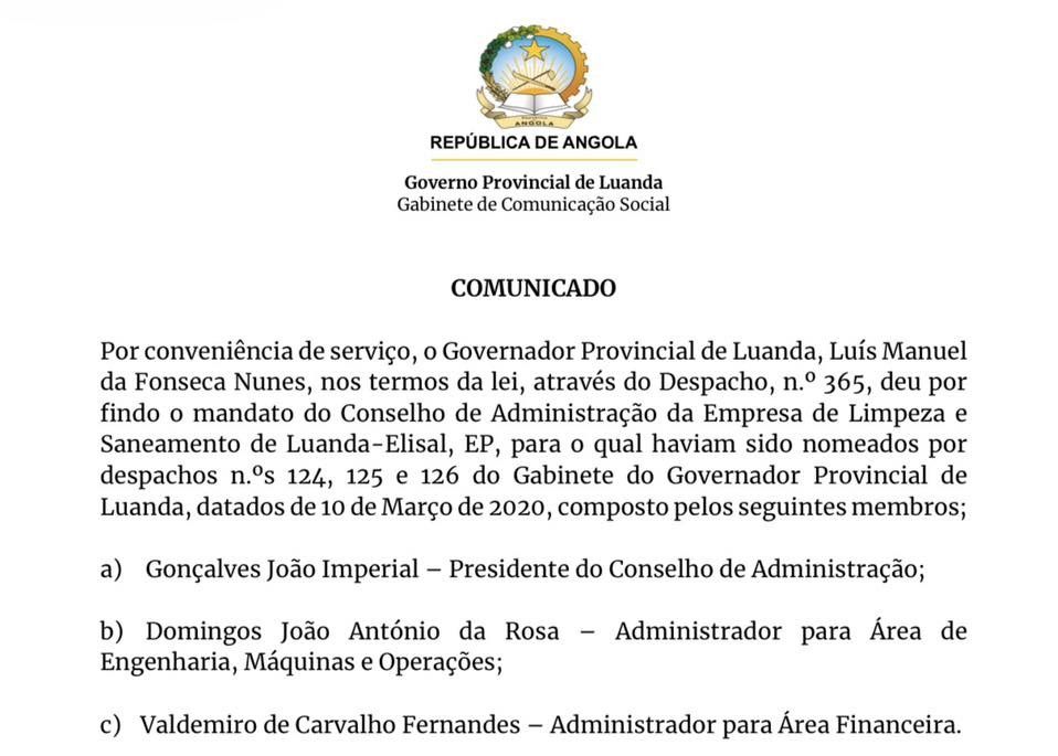 Por conveniência de serviço, o Governador Provincial de Luanda, Luís Manuel da Fonseca Nunes, nos termos da lei, através do Despacho, n.º 365, deu por findo o mandato do Conselho de Administração da Empresa de Limpeza e Saneamento de Luanda-Elisal, EP, para o qual haviam sido nomeados por despachos n.ºs 124, 125 e 126 do Gabinete do Governador Provincial de Luanda, datados de 10 de Março de 2020, composto pelos seguintes membros;