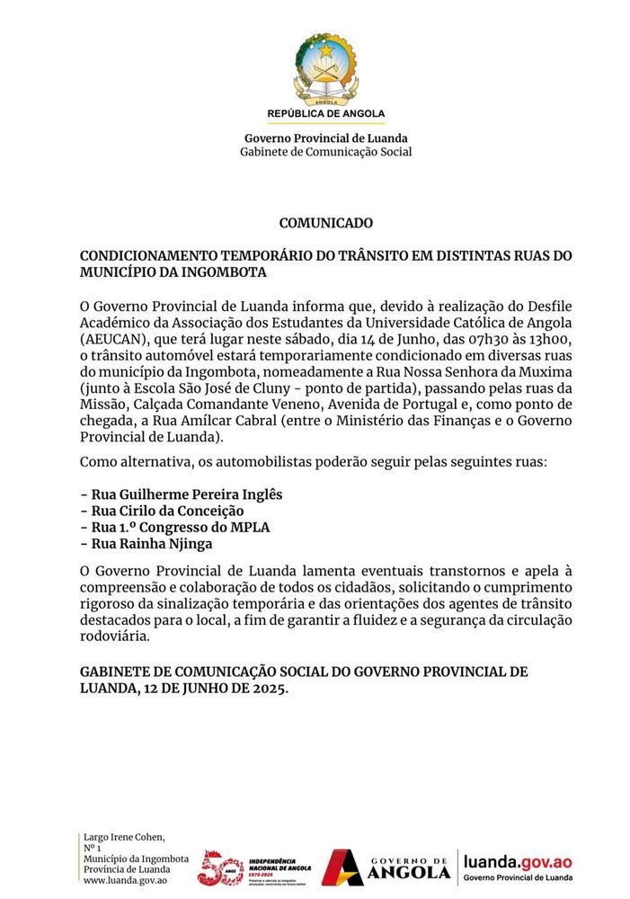 O Governo Provincial de Luanda informa que, devido à realização do Desfile Académico da Associação dos Estudantes da Universidade Católica de Angola (AEUCAN), que terá lugar neste sábado, dia 14 de Junho, das 07h30 às 13h00, o trânsito automóvel estará temporariamente condicionado em diversas ruas do município da Ingombota, nomeadamente a Rua Nossa Senhora da Muxima (junto à Escola São José de Cluny - ponto de partida), passando pelas ruas da Missão, Calçada Comandante Veneno, Avenida de Portugal e, como ponto de chegada, a Rua Amílcar Cabral (entre o Ministério das Finanças e o Governo Provincial de Luanda).