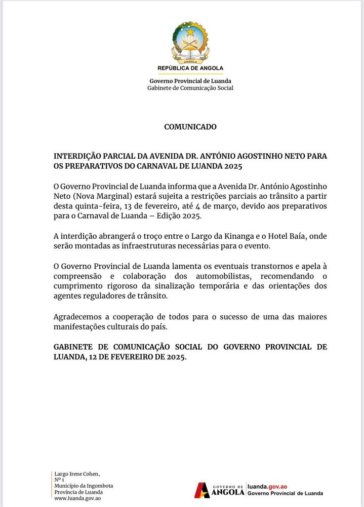 A medida deve-se aos trabalhos de montagem das estruturas destinadas à realização do Carnaval de Luanda – Edição 2026, agendado para os dias 14, 15 e 16 de Fevereiro.