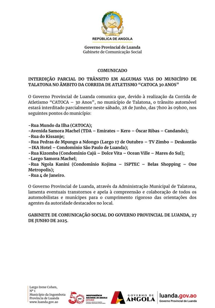 O Governo Provincial de Luanda comunica que, devido à realização da Corrida de Atletismo “CATOCA – 30 Anos”, no município de Talatona, o trânsito automóvel estará interditado parcialmente neste sábado, 28 de Junho, das 7h00 às 09h00, nos seguintes pontos do município: