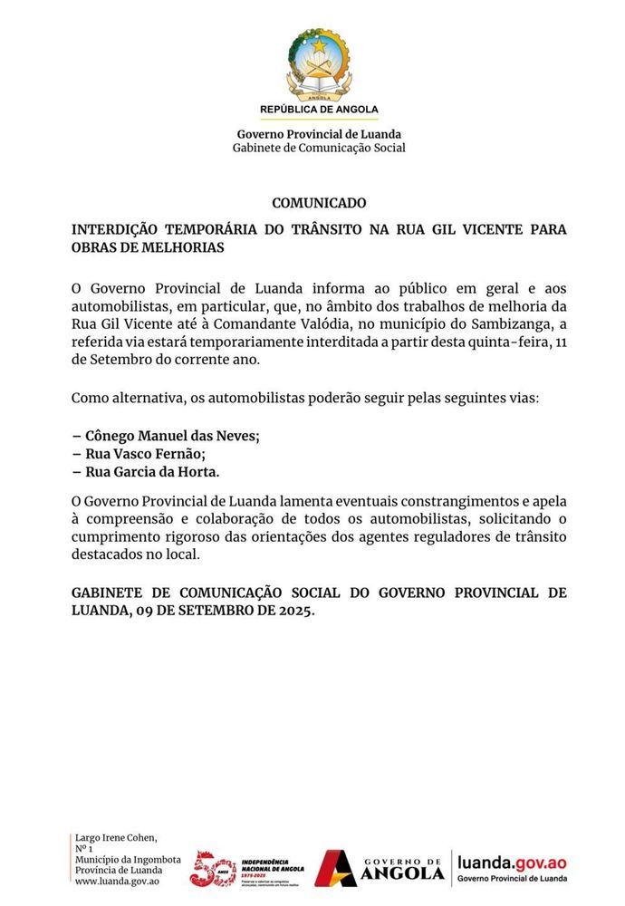 O Governo Provincial de Luanda informa ao público em geral e aos automobilistas, em particular, que, no âmbito dos trabalhos de melhoria da Rua Gil Vicente até à Comandante Valódia, no município do Sambizanga, a referida via estará temporariamente interditada a partir desta quinta-feira, 11 de Setembro do corrente ano.