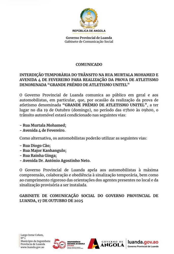 O Governo Provincial de Luanda comunica ao público em geral e aos automobilistas, em particular, que, por ocasião da realização da prova de atletismo denominada “GRANDE PRÉMIO DE ATLETISMO UNITEL”, a ter lugar no dia 19 de Outubro (domingo), no período das 07h00 às 09h00, o trânsito automóvel estará condicionado nas seguintes vias: