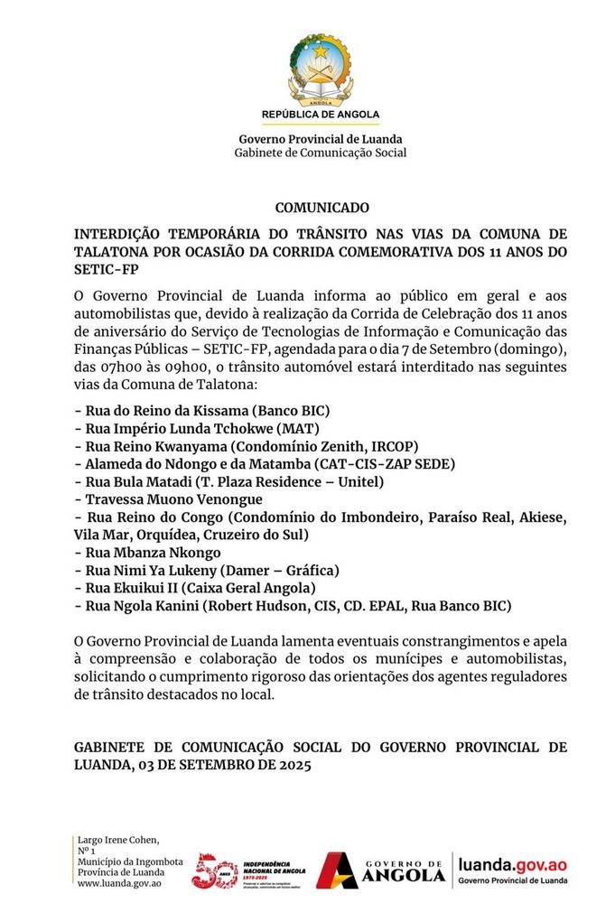 O Governo Provincial de Luanda informa ao público em geral e aos automobilistas que, devido à realização da Corrida de Celebração dos 11 anos de aniversário do Serviço de Tecnologias de Informação e Comunicação das Finanças Públicas – SETIC-FP, agendada para o dia 7 de Setembro (domingo), das 07h00 às 09h00, o trânsito automóvel estará interditado nas seguintes vias da Comuna de Talatona: