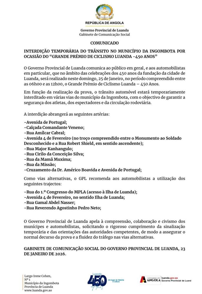 O Governo Provincial de Luanda comunica ao público em geral, e aos automobilistas em particular, que no âmbito das celebrações dos 450 anos da fundação da cidade de Luanda, será realizado neste domingo, 25 de Janeiro, no período compreendido entre as 06h00 e as 12h00, o Grande Prémio de Ciclismo Luanda – 450 Anos.