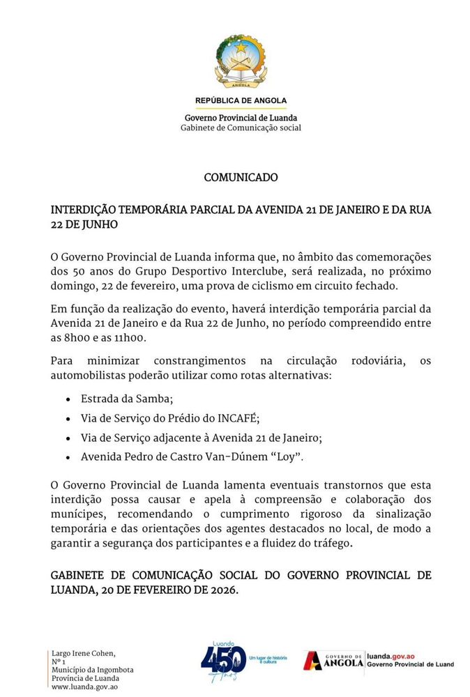 O Governo Provincial de Luanda lamenta eventuais transtornos que esta interdição possa causar e apela à compreensão e colaboração dos munícipes, recomendando o cumprimento rigoroso da sinalização temporária e das orientações dos agentes destacados no local, de modo a garantir a segurança dos participantes e a fluidez do tráfego.