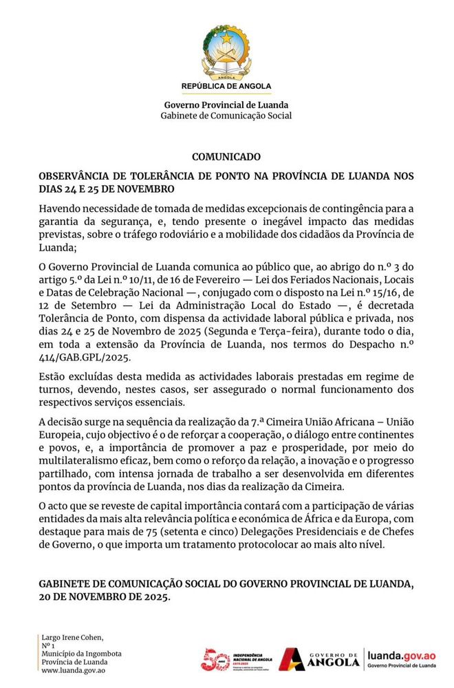 O Governo Provincial de Luanda comunica ao público que, ao abrigo do n.º 3 do artigo 5.º da Lei n.º 10/11, de 16 de Fevereiro — Lei dos Feriados Nacionais, Locais e Datas de Celebração Nacional —, conjugado com o disposto na Lei n.º 15/16, de 12 de Setembro — Lei da Administração Local do Estado —, é decretada Tolerância de Ponto, com dispensa da actividade laboral pública e privada, nos dias 24 e 25 de Novembro de 2025 (Segunda e Terça-feira), durante todo o dia, em toda a extensão da Província de Luanda, nos termos do Despacho n.º 414/GAB.GPL/2025.