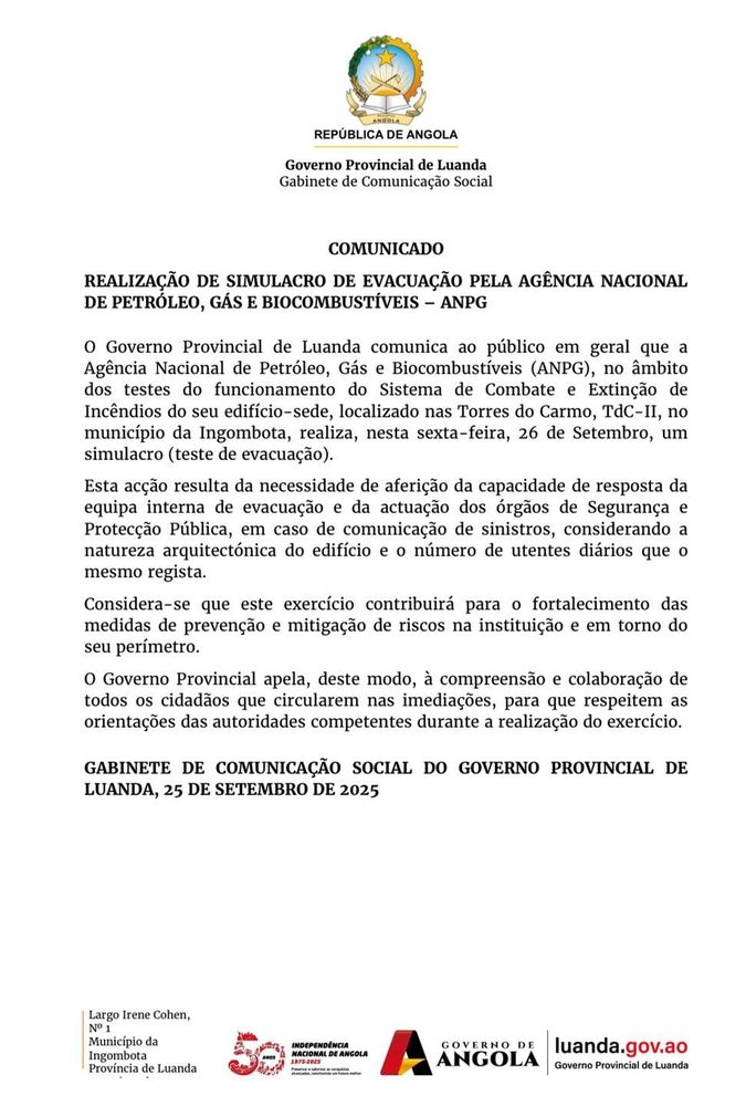 O Governo Provincial de Luanda comunica ao público em geral que a Agência Nacional de Petróleo, Gás e Biocombustíveis (ANPG), no âmbito dos testes do funcionamento do Sistema de Combate e Extinção de Incêndios do seu edifício-sede, localizado nas Torres do Carmo, TdC-II, no município da Ingombota, realiza, nesta sexta-feira, 26 de Setembro, um simulacro (teste de evacuação).