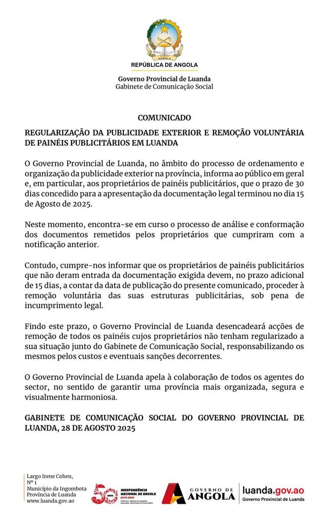 O Governo Provincial de Luanda, no âmbito do processo de ordenamento e organização da publicidade exterior na província, informa ao público em geral e, em particular, aos proprietários de painéis publicitários, que o prazo de 30 dias concedido para a apresentação da documentação legal terminou no dia 15 de Agosto de 2025.
