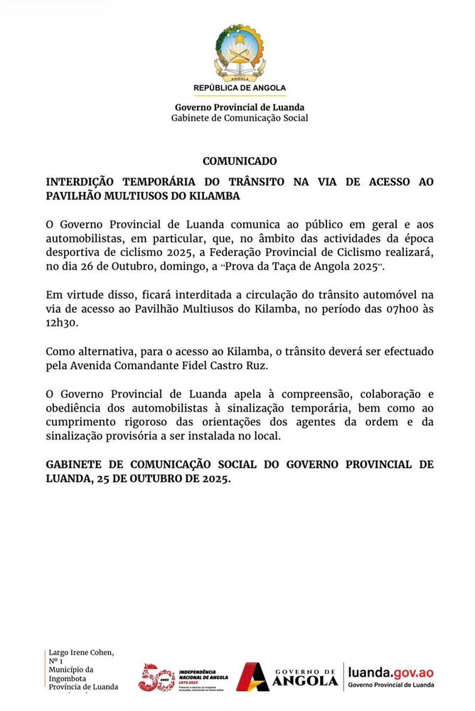 O Governo Provincial de Luanda comunica ao público em geral e aos automobilistas, em particular, que, no âmbito das actividades da época desportiva de ciclismo 2025, a Federação Provincial de Ciclismo realizará, no dia 26 de Outubro, domingo, a “Prova da Taça de Angola 2025”.