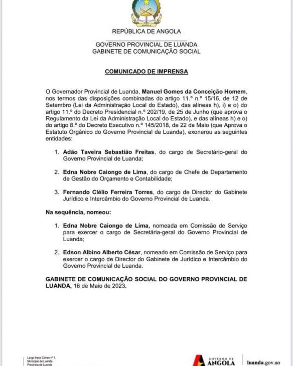 O Governador Provincial de Luanda procedeu a alterações na composição da sua equipa, tendo nomeado Edna Nobre Caiongo de Lima para o cargo de Secretária-geral do Governo Provincial de Luanda.