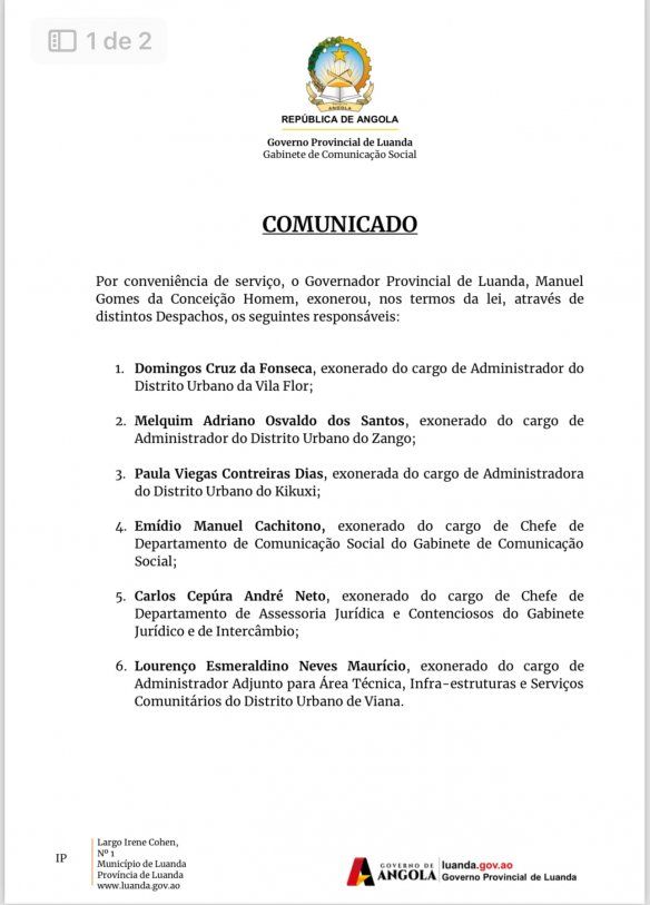 Por conveniência de serviço, o Governador Provincial de Luanda, Manuel Gomes da Conceição Homem, exonerou, nos termos da lei, através de distintos Despachos, os seguintes responsáveis:1.Domingos Cruz da Fonseca, exonerado do cargo de Administrador do Distrito Urbano da Vila Flor;2. Melquim Adriano Osvaldo dos Santos, exonerado do cargo de Administrador do Distrito Urbano do Zango;3. Paula Viegas Contreiras Dias, exonerada do cargo de Administradora do Distrito Urbano do Kikuxi;4. Emídio Manuel Cachitono, exonerado do cargo de Chefe de Departamento de Comunicação Social do Gabinete de Comunicação Social;5. Carlos Cepúra André Neto, exonerado do cargo de Chefe de Departamento de Assessoria Jurídica e Contenciosos do Gabinete Jurídico e de Intercâmbio;6. Lourenço Esmeraldino Neves Maurício, exonerado do cargo de Administrador Adjunto para Área Técnica, Infra-estruturas e Serviços Comunitários do Distrito Urbano de Viana.Na sequência, através de outros Despachos, o Governador Provincial de Luanda, Manuel Gomes da Conceição Homem, nomeou, nos termos da lei, as seguintes entidades:1. Esmeraldino Fernando Bernardo Paulo, nomeado para exercer o cargo de Administrador Adjunto para Área Técnica, Infra-estruturas e Serviços Comunitários do Município de Viana;2. Lourenço Esmeraldino Neves Maurício, nomeado para exercer o cargo de Administrador do Distrito Urbano da Vila Flor;3. Célsio do Rosário Mateus de Carvalho, nomeado para exercer cargo de Administrador do Distrito Urbano do Zango;4. William Leandro Faria Morais, nomeado para exercer o cargo de Administrador do Distrito Urbano do Kikuxi;5. Eduardo Augusto da Costa Coelho, nomeado para exercer o cargo de Administrador Adjunto para Área Técnica, Infra-estruturas e Serviços Comunitários do Distrito Urbano de Viana;6. Edson Dias Fernandes, nomeado para exercer o cargo de Chefe de Departamento de Tráfego e Mobilidade do Gabinete Provincial de Transportes, Tráfego e Mobilidade Urbana;7. Maria Amarilda Pinto Quissindo, nomeada para exercer a função de Secretária do Gabinete do Vice-Governador para o Sector Económico;8. Walter Alfredo Faz-Tudo Joaquim, nomeado para exercer a função de Motorista da Residência do Vice-Governador para o Sector Económico.GABINETE DE COMUNICAÇÃO SOCIAL DO GOVERNO PROVINCIAL DE LUANDA, 10 de Abril de 2024.