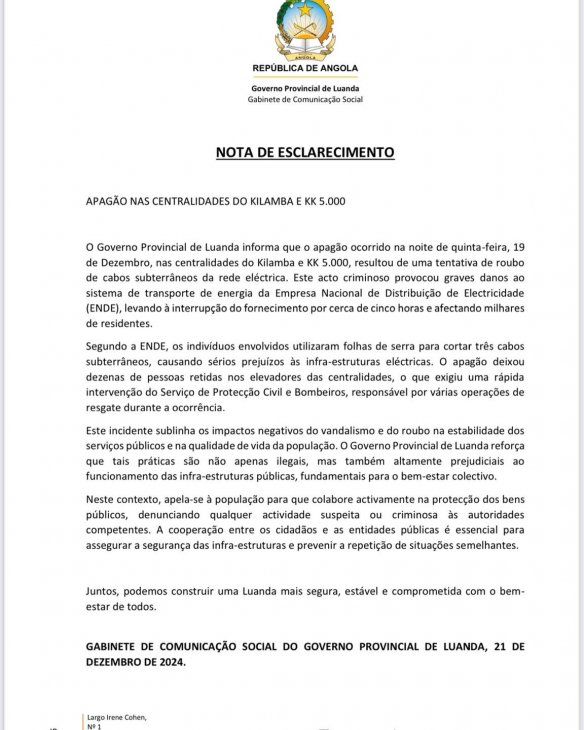 O Governo Provincial de Luanda informa que o apagão ocorrido na noite de quinta-feira, 19 de Dezembro, nas centralidades do Kilamba e KK 5.000, resultou de uma tentativa de roubo de cabos subterrâneos da rede eléctrica. Este acto criminoso provocou graves danos ao sistema de transporte de energia da Empresa Nacional de Distribuição de Electricidade (ENDE), levando à interrupção do fornecimento por cerca decinco horas e afectando milhares de residentes.Segundo a ENDE, os indivíduos envolvidos utilizaram folhas de serra para cortar três cabos subterrâneos, causando sérios prejuízos às infra-estruturas eléctricas. O apagão deixou dezenas de pessoas retidas nos elevadores das centralidades, o que exigiu uma rápida intervenção do Serviço de Protecção Civil e Bombeiros, responsável por várias operações de resgate durante a ocorrência.Este incidente sublinha os impactos negativos do vandalismo e do roubo na estabilidade dos serviços públicos e na qualidade de vida da população. O Governo Provincial de Luanda reforça que tais práticas são não apenas ilegais, mas também altamente prejudiciais ao funcionamento das infra-estruturas públicas, fundamentais para o bem-estar colectivo.Neste contexto, apela-se à população para que colabore activamente na protecção dos bens públicos, denunciando qualquer actividade suspeita ou criminosa às autoridades competentes. A cooperação entre os cidadãos e as entidades públicas é essencial para assegurar a segurança das infra-estruturas e prevenir a repetição de situações semelhantes.Juntos, podemos construir uma Luanda mais segura, estável e comprometida com o bem-estar de todos.GABINETE DE COMUNICAÇÃO SOCIAL DO GOVERNO PROVINCIAL DE LUANDA, 21 DEDEZEMBRO DE 2024.