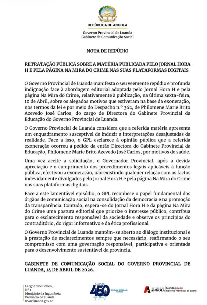 O Governo Provincial de Luanda manifesta o seu veemente repúdio e profunda indignação face à abordagem editorial adoptada pelo Jornal Hora H e pela página Na Mira do Crime, relativamente à publicação, na última sexta-feira, 10 de Abril, sobre os alegados motivos que estiveram na base da exoneração, nos termos da lei e por meio do Despacho n.º 362, de Philomene Marie Brito Azevedo José Carlos, do cargo de Directora do Gabinete Provincial da Educação do Governo Provincial de Luanda.