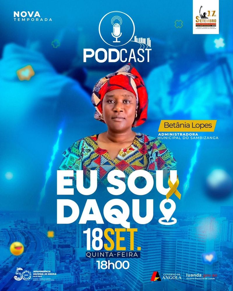 A segunda edição da nova temporada do podcast "EU SOU DAQUI" será transmitida na quinta-feira, 18 de Setembro, a partir das 18h00. O assunto em abordagem estará a volta da nova Divisão Político-Administrativa do Município do Sambizanga.