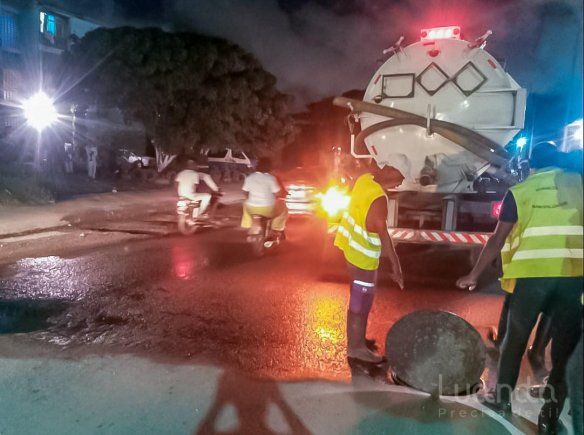 sucção das águas e manutenção de colectores, que apresentavam obstruções pelo acúmulo de resíduos sólidos, numa extensão de 240 metros, na rua Machado Saldanha, com foco em restabelecer a funcionalidade da infra-estrutura e optimizar acapacidade de escoamento de água no Distrito Urbano do Golfe, município do Kilamba Kiaxi.Gabinete de Comunicação Social do Governo Provincial de Luanda